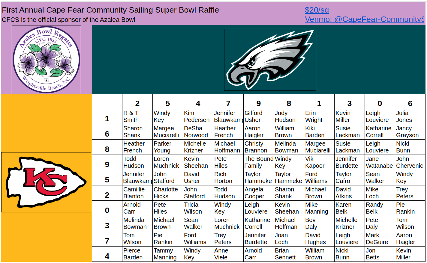 Table gets updated every 5 minutes. View realtime on Google Sheets: CFCS Super Bowl Raffle